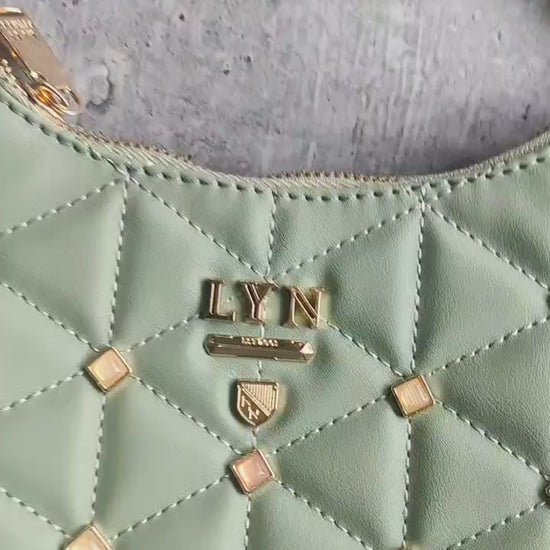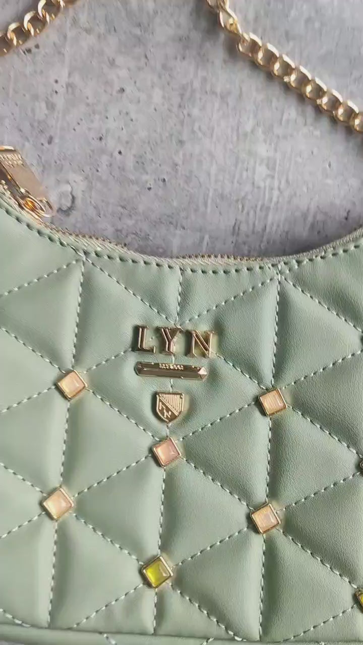 - Features: Quilted design, studded accents, adjustable gold chain strap