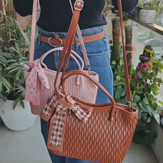 Add a touch of elegance and sophistication to your look with this beautifully textured Margot Handbag by RêVE. Designed for both style and functionality, this bag is perfect for work, travel, or casual outings. The soft blush pink color, paired with a chic scarf accent, makes this a must-have accessory for any fashion-forward individual.