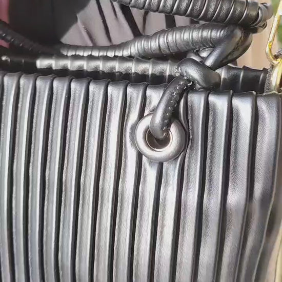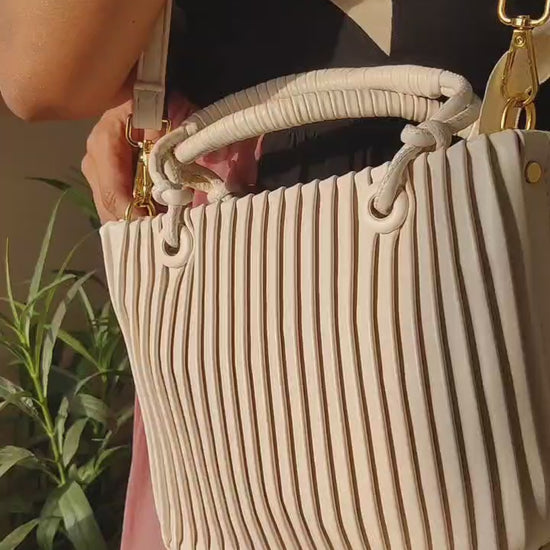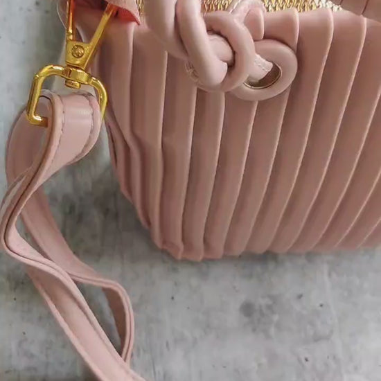 Crafted from soft faux leather with a structured, vertical pleated design, each bag features coiled top handles for a designer-inspired look and a removable strap for hands-free convenience. Whether worn as a shoulder bag or crossbody, this piece brings effortless charm to your everyday style.