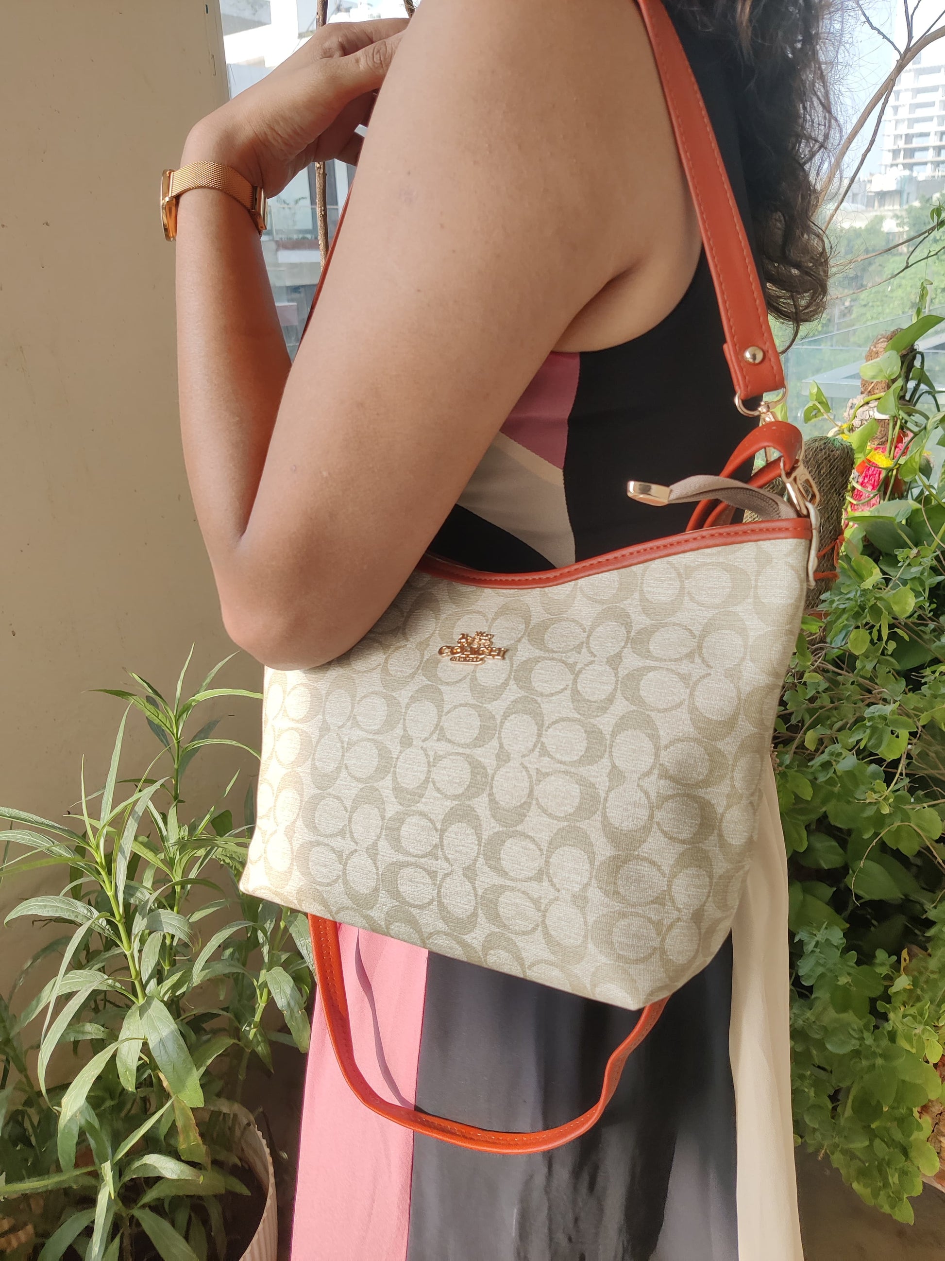 - Gold-tone chain accent for a luxurious look