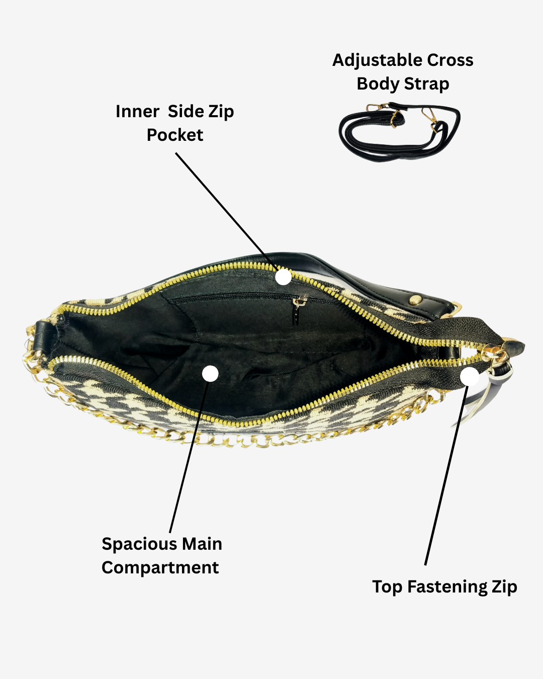 Make a bold fashion statement with the Trixie Houndstooth Sling Bag by RêVE, featuring the timeless black-and-beige houndstooth pattern. Designed with a luxe gold chain accent and a detachable strap, this bag effortlessly blends elegance with versatility. Compact yet functional, it’s perfect for elevating your everyday or evening looks.
