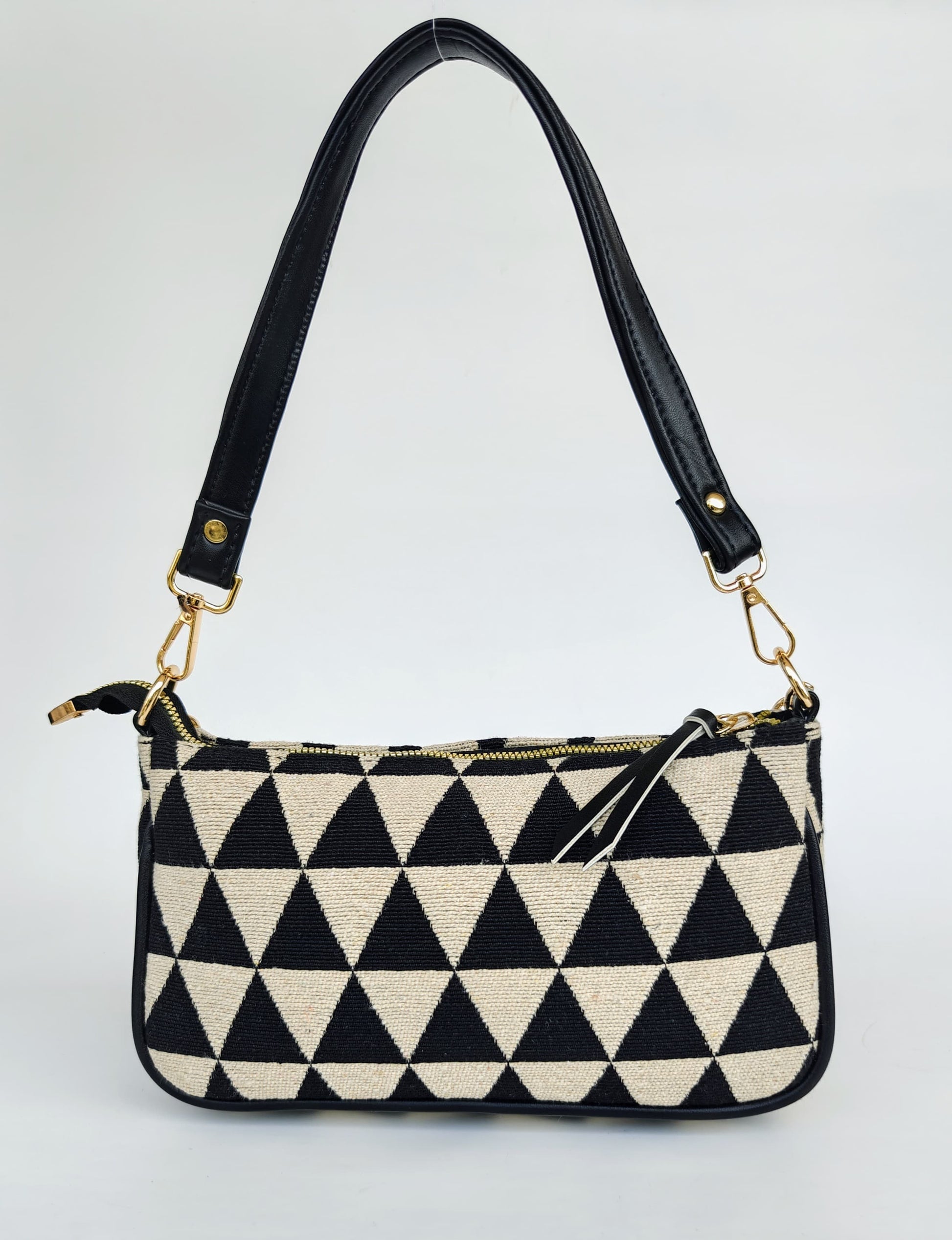 levate your style with the Trixie Prism Sling Bag by RêVE , a perfect blend of chic design and everyday functionality. Crafted with bold black-and-beige geometric patterns, it comes with a luxe gold chain detail and detachable strap for versatile styling. This compact yet stylish sling is your go-to companion for making a statement wherever you go.